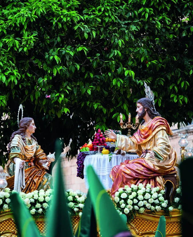 Tallado en madera policromada, representa a María Magdalena en actitud penitente, portado por 38 estantes.