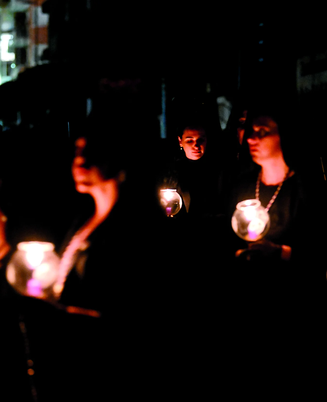 Las túnicas negras y moradas subrayan su carácter penitencial, sin ornatos ni estridencias.