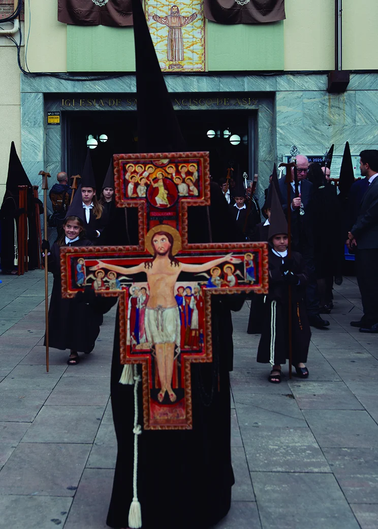 Introducida en el año de fundación, la Cruz Guía lidera el cortejo de 110 nazarenos, marcando el camino para los pasos del Santísimo Cristo de la Fe y Santa María de los Ángeles.