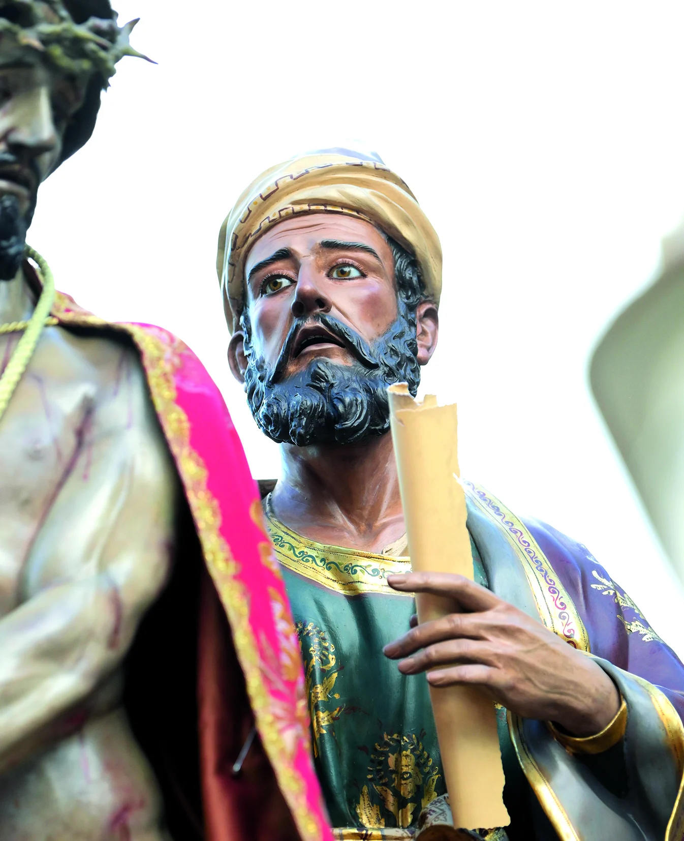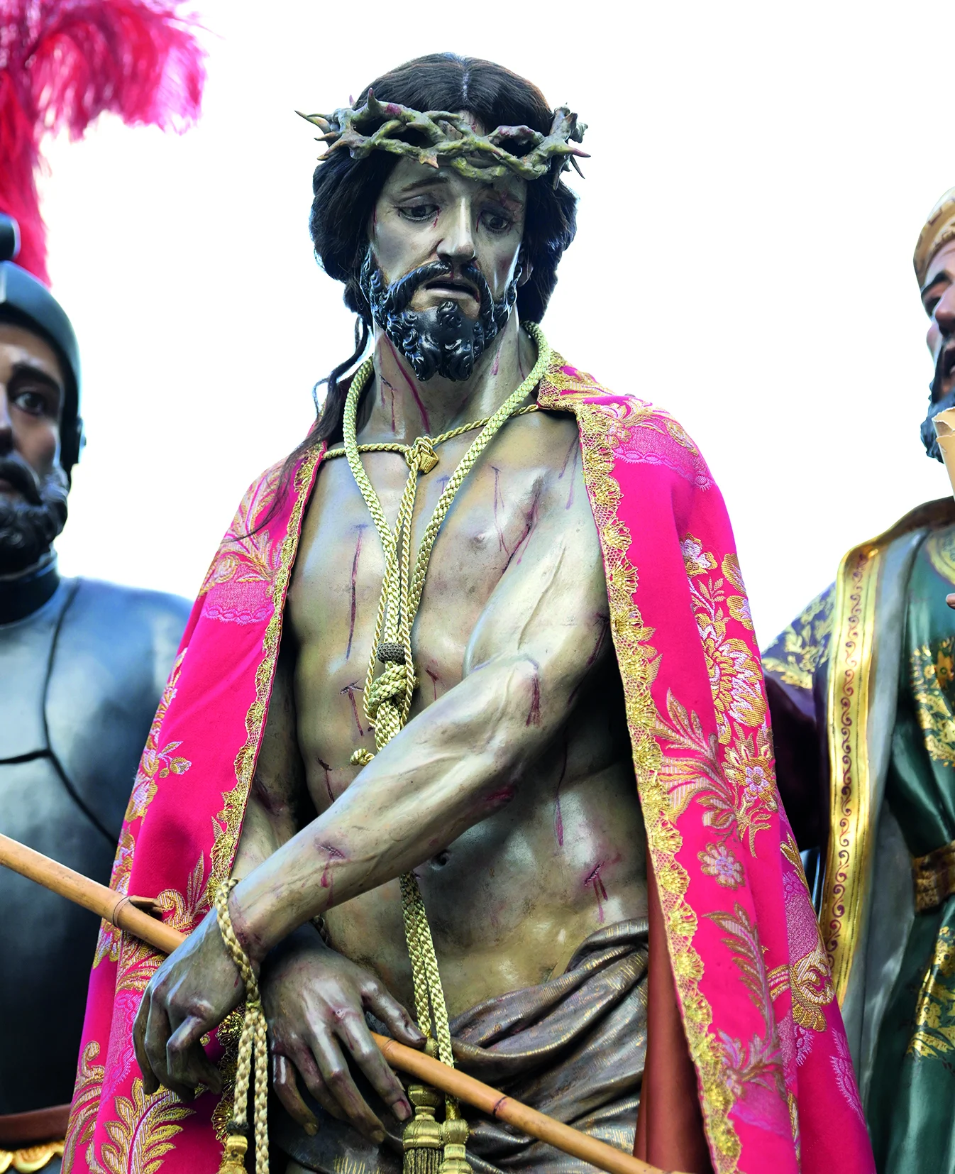 La combinación de estilos —barroco, neobarroco y actualización contemporánea— crea una escena sólida y tensa, donde se subraya la injusticia del juicio y la dignidad de Cristo frente al poder humano.