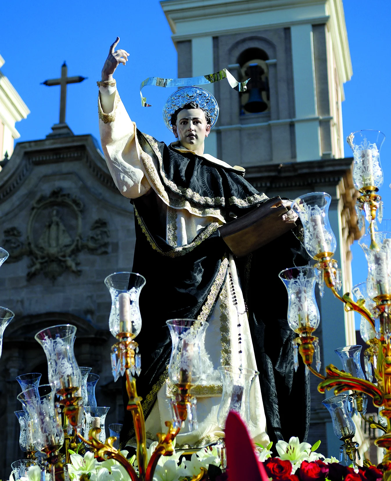 La imagen muestra al santo dominico en actitud predicadora, fiel a su misión de anunciar la conversión y la esperanza desde la ortodoxia cristiana.