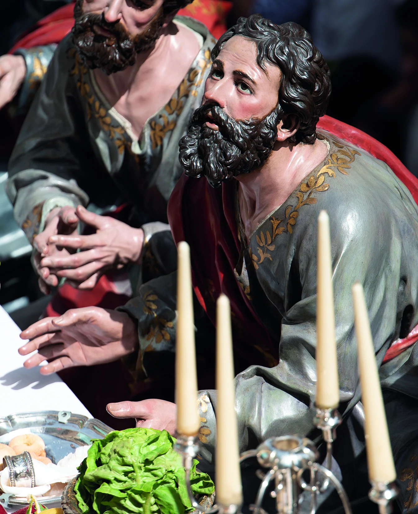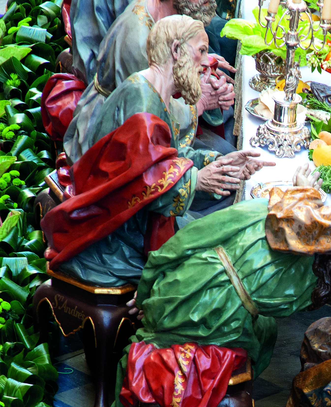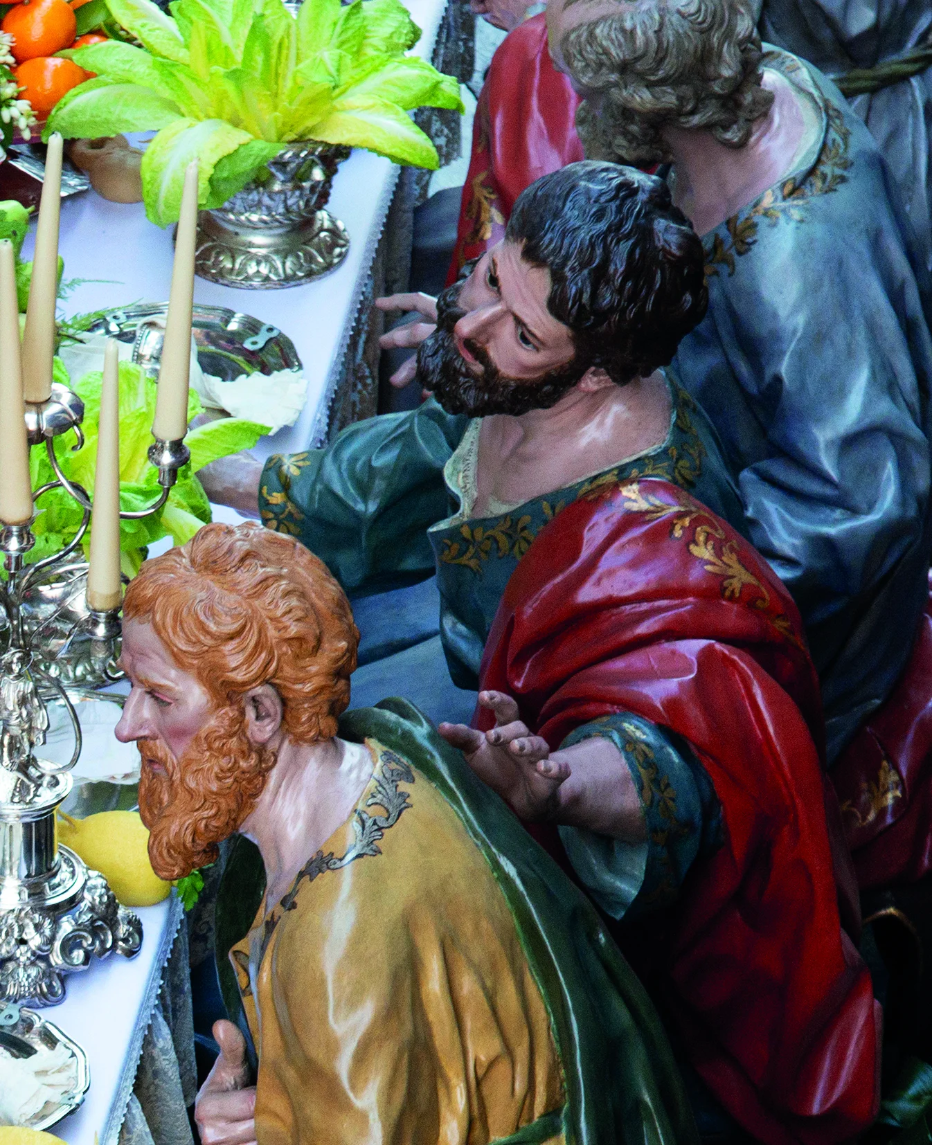 Salzillo organiza la mesa con una armonía teatral y catequética: Cristo en actitud serena, los apóstoles distribuidos en diálogos y gestos que revelan sorpresa, afecto o inquietud ante el anuncio de la traición.