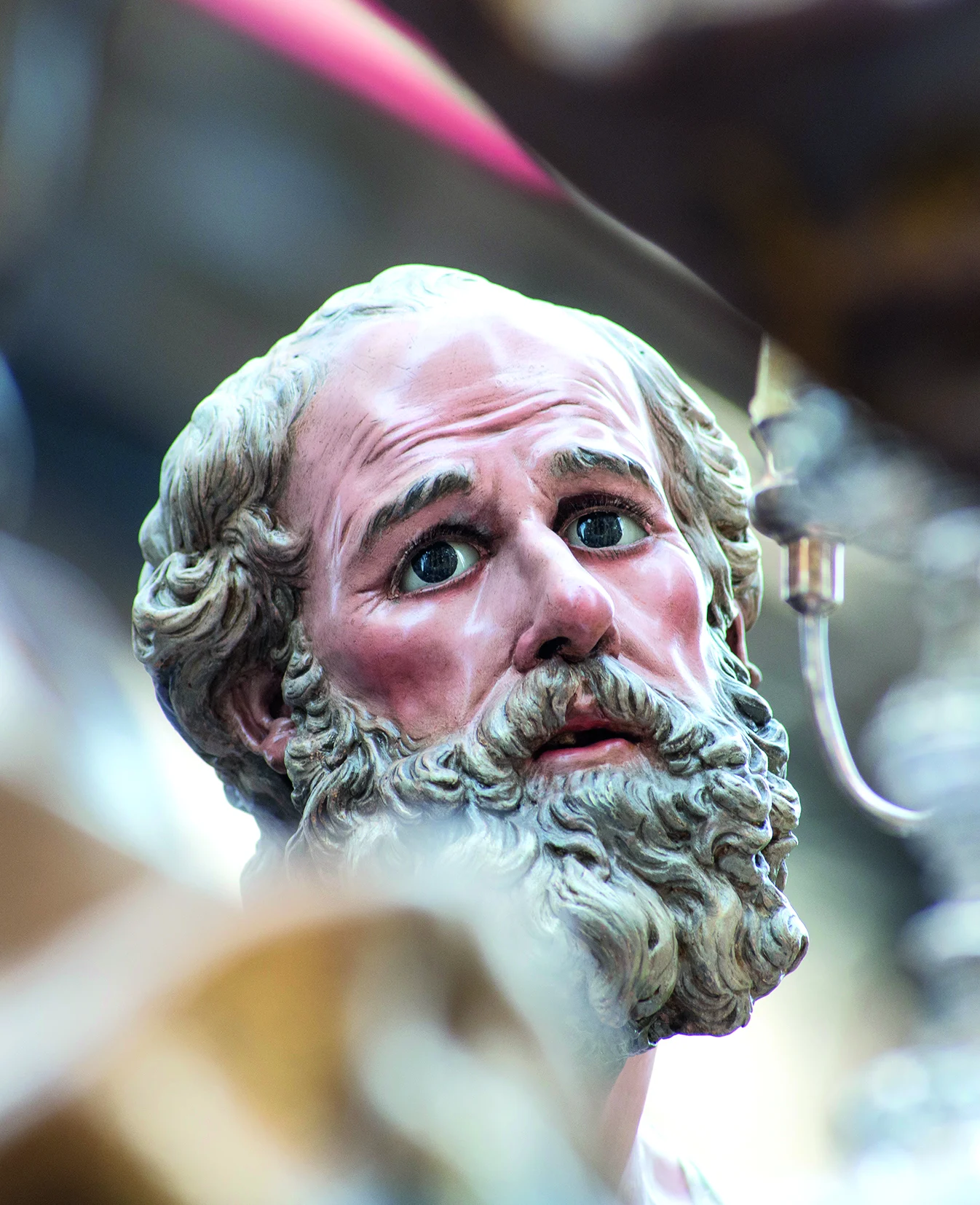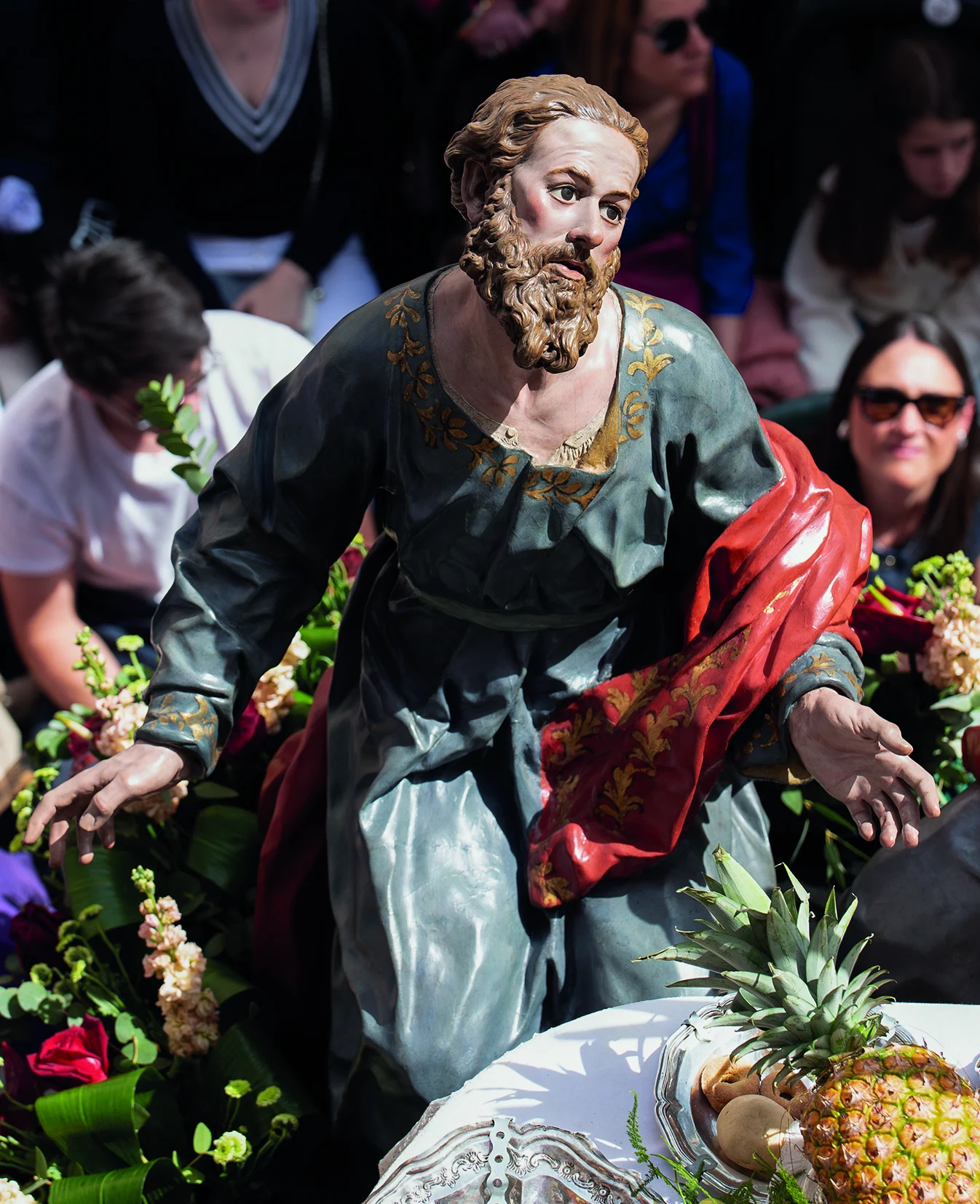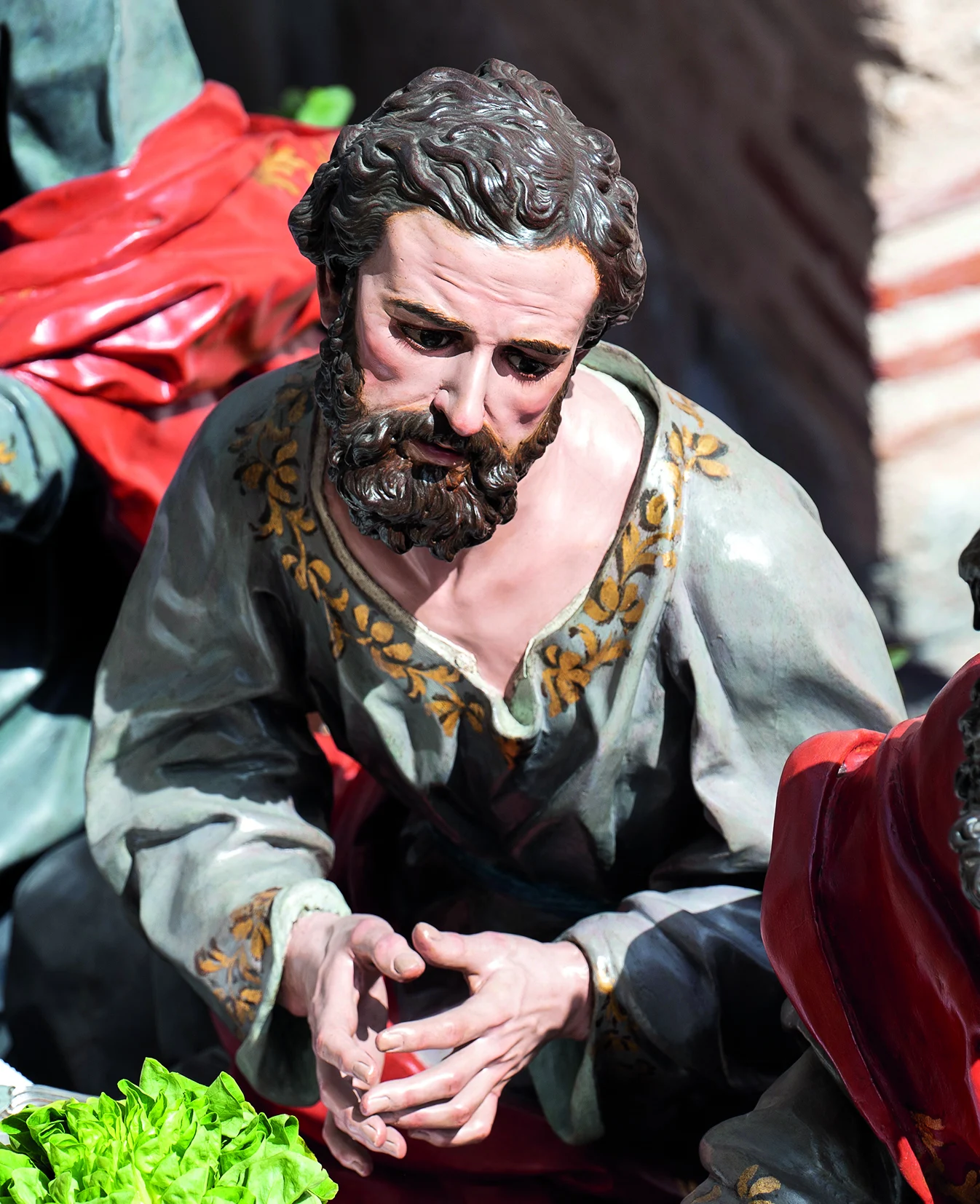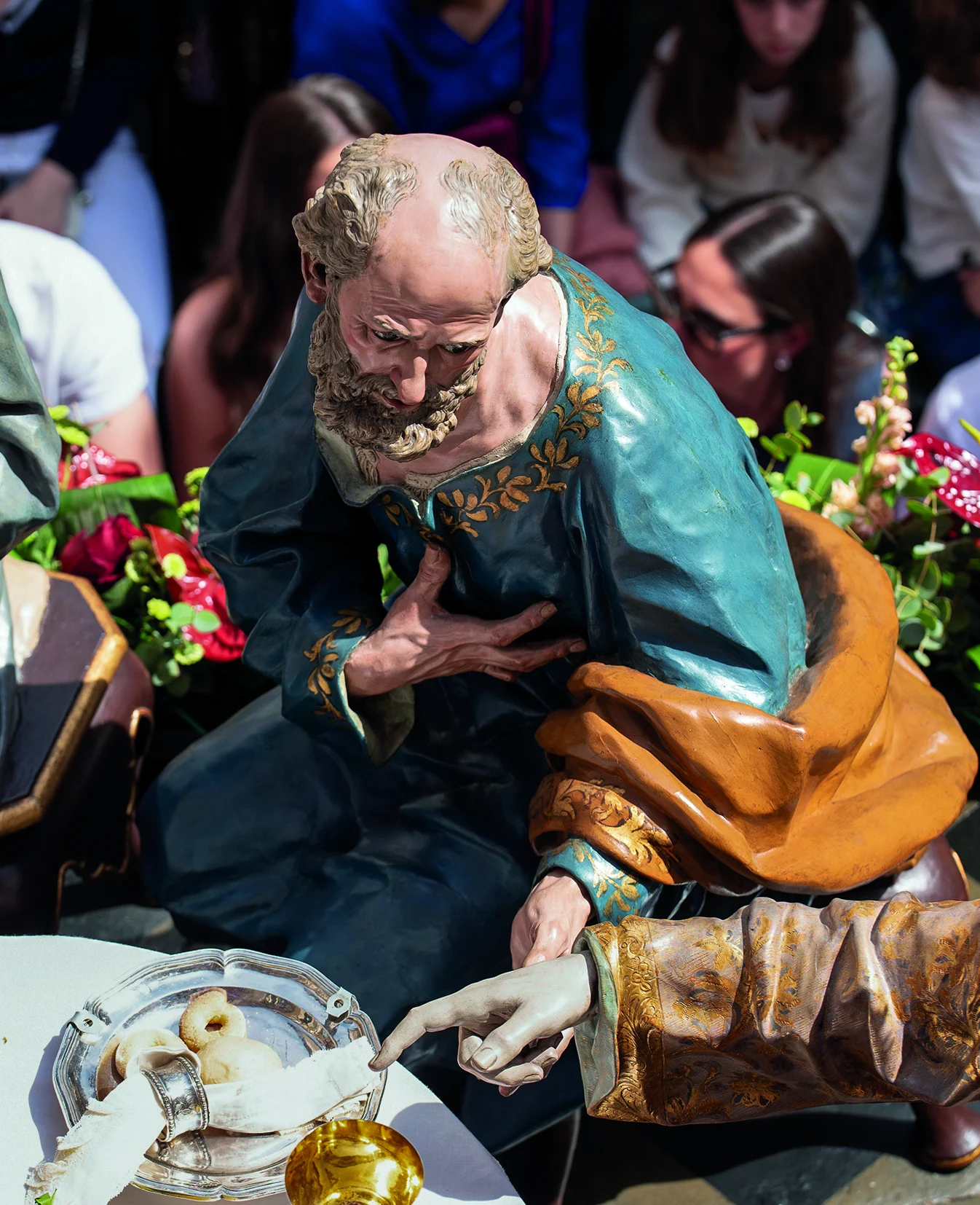 Salzillo organiza la mesa con una armonía teatral y catequética: Cristo en actitud serena, los apóstoles distribuidos en diálogos y gestos que revelan sorpresa, afecto o inquietud ante el anuncio de la traición.
