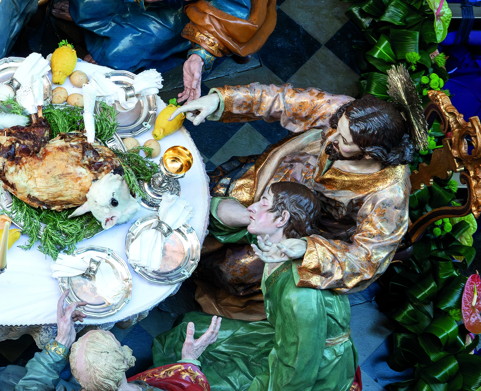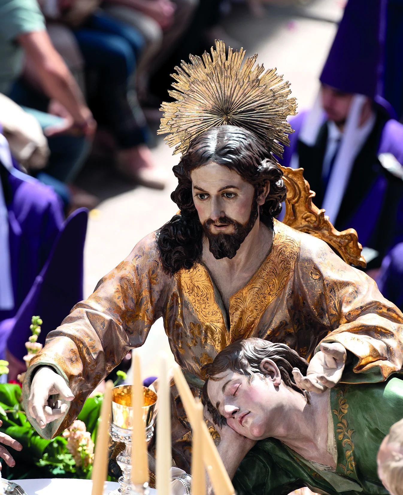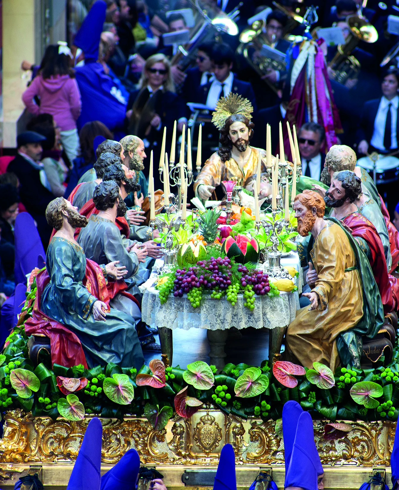 El paso de La Santa Cena, obra de Francisco Salzillo en 1761 y llevado por 28 estantes, representa el momento del Evangelio de Mateo 26,17-29 y paralelos, cuando Jesús instituye la Eucaristía en la Última Cena.